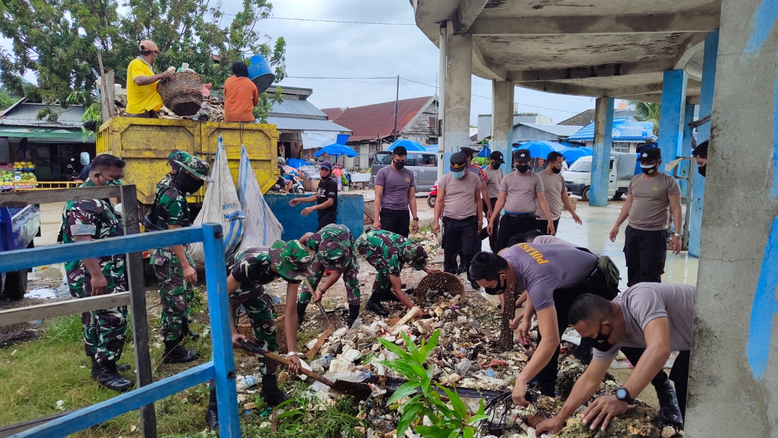 “Tumpukan sampah di titik-titik ini sangat banyak sebagai akibat dari cuaca buruk yang terjadi beberapa hari terakhir. Makanya kita bahu-membahu membersihkan. Ada anggota Polri 3 peleton, TNI 2 peleton dibantu dengan pegawai Dinas Kebersihan Kota,” terangnya, Selasa (22/2). Kurang lebih dua jam membenahi tiga lokasi itu, arus lalulintas berangsur membaik. Potongan kayu yang berasal dari kios-kios yang ambruk sudah dirapikan. Sehingga para pedagang pun mulai menggelar lapak darurat untuk melanjutkan aktivitas sehari-harinya di pasar.