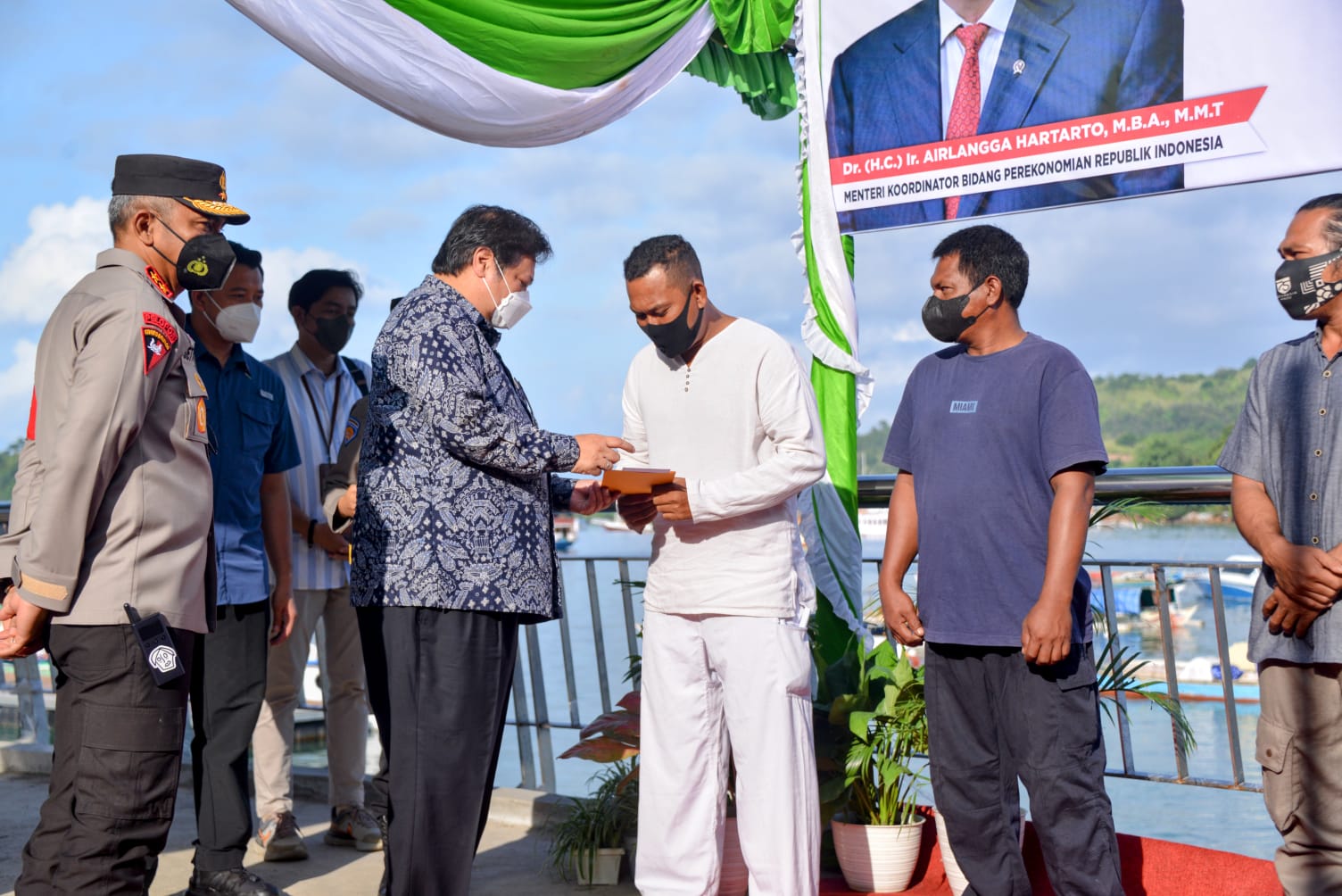 Menko Bidang Perekonomian RI, Airlangga Hartarto menyerahkan bantua tunai kepada salah satu nelayan di Labuan Bajo. (FOTO : KEMENKO PEREKONOMIAN RI FOR KENDARI NEWS)