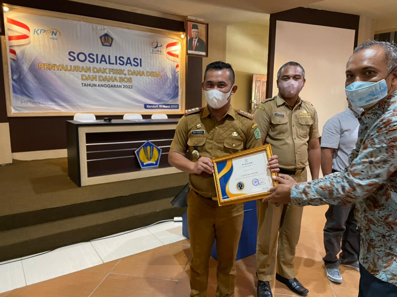 Kepala Dinas Pemberdayaan Masyarakat Desa (DPMD) Konawe, Keni Yuga Permana menerima langsung reward yang diserahkan Kepala KPPN Kendari, Teguh Ratno Sukarno. Reward itu diberikan saat giat Sosialisasi Penyaluran DAK Fisik, Dana Desa, dan Dana BOS, Rabu (16/3).