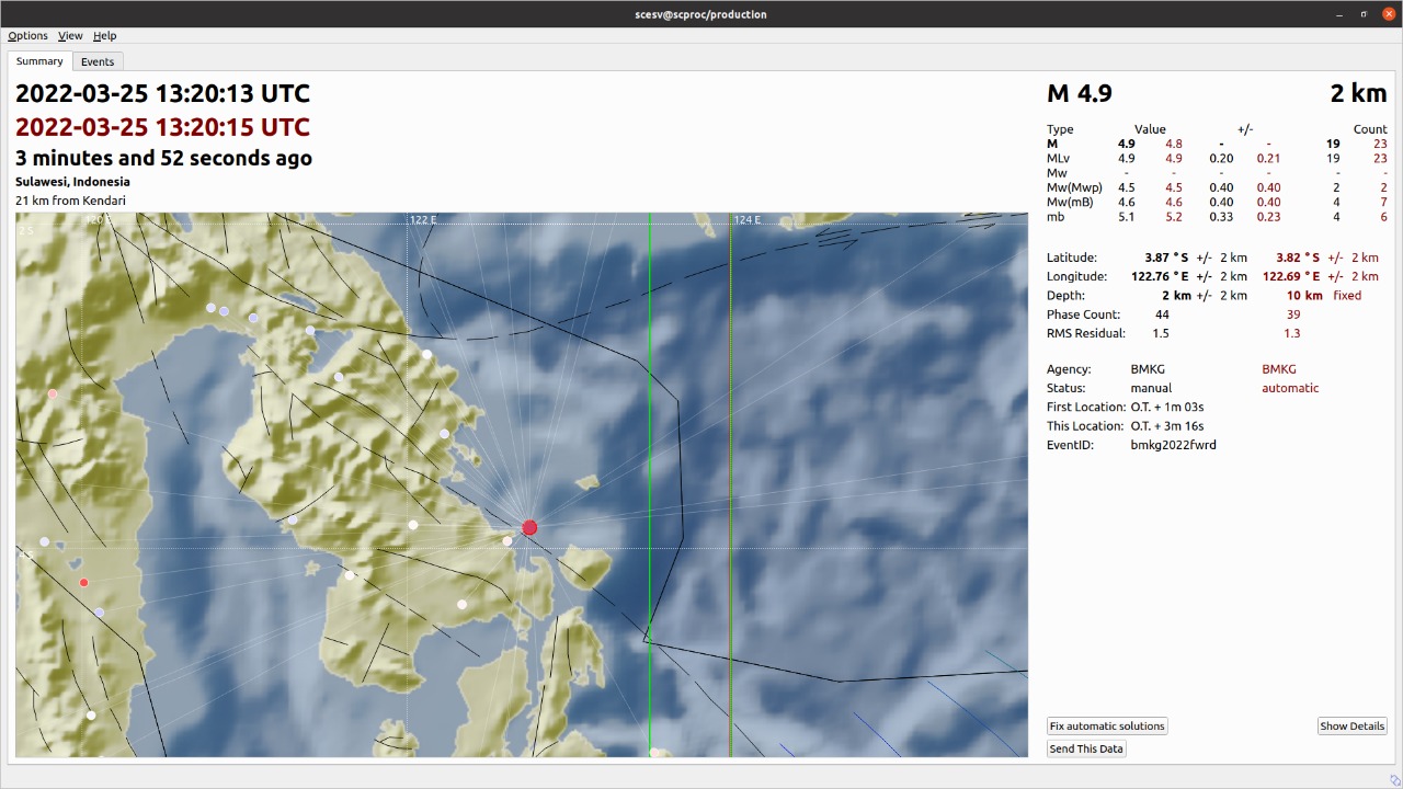 Berdasarkan rilis Stasion Geofisika Kendari melalui group WhatsApp Stakeholder BMKG Sultra, lokasi gempa berada di 3.87 lintang Selatan (LS), 112.76 bujur Timur (BT) atau di 11,9 kilometer (km) Timur Laut Soropia, Konawe. Titik gempa dikedalaman 2 km dengan kekuatan 4,9 skala richter.