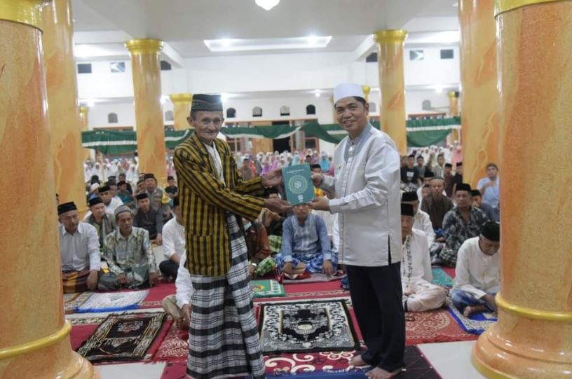 Bupati La Bakry saat menyerahkan wakaf Quran secara simbolis kepada imam masjid Nur muhammad Wabula