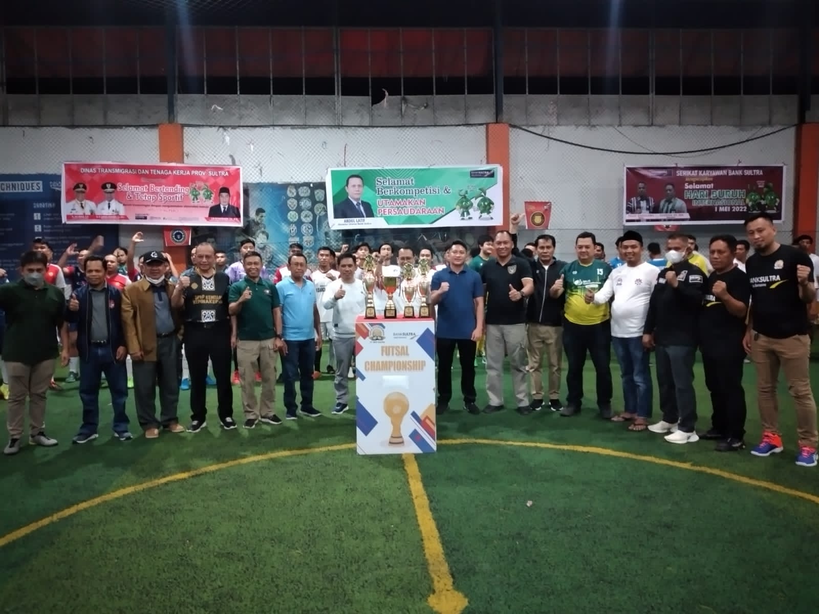 KENDARINEWS.COM – Sebanyak 12 tim dari Serikat Pekerja (SP), Serikat Buruh (SB), Federasi SP/BP, dan Konfederasi SP/PB di Sultra unjuk skill dalam Liga Futsal 2022 digelar Dinas Transmigrasi dan Tenaga Kerja (Disnaker) dan Bank Sultra yang di gelar di Lapangan Futsal Plaza Kubra, Kamis (14/04/2022).