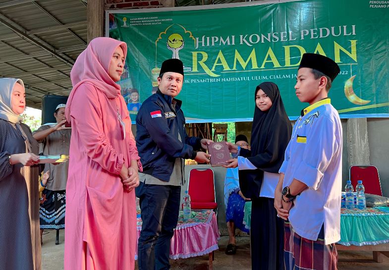 KENDARIPOS.CO.ID–Ketua BPC HIPMI Konawe Selatan Dirga Mubarak bersama pengurus BPC HIPMI Konsel menyerahkan bantuan kepada kaum duafa dan wakaf Al Quran di kecamatan Konda, Desa Cialam Jaya, Minggu (24/04/2022).