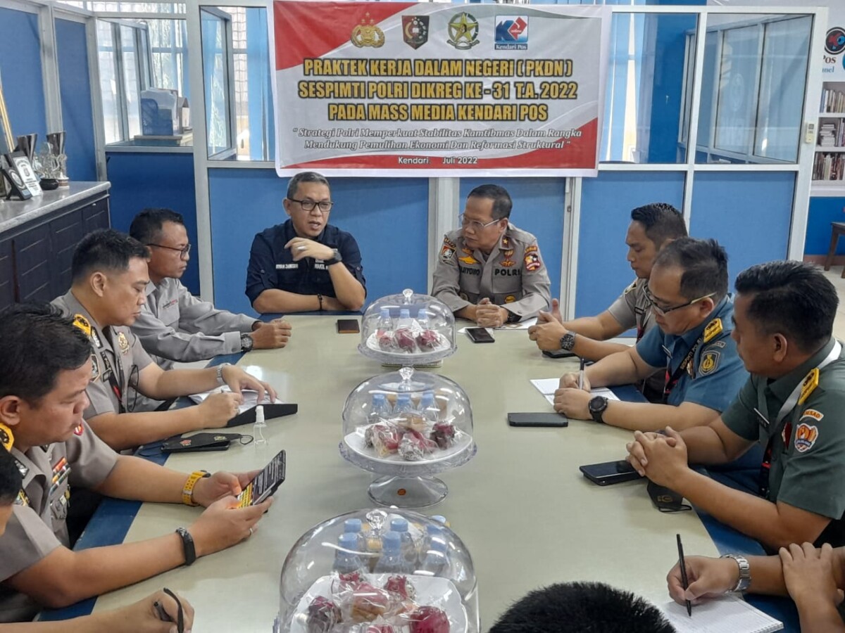 KENDARINEWS.COM–Sebanyak delapan peserta didik Sekolah Staf dan Pimpinan Tinggi (Sespimti) Polri Dikreg ke-31 Tahun 2022 melaksanakan Praktik Kerja Dalam Negeri (PKDN) di Graha Pena Kendari Pos, Rabu (27/7)