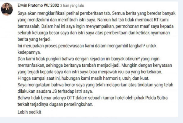Dalam hal ini, Erwin pun ingin menyampaikan permohonan maaf kepada seluruh keluarga besarnya dan keluar besar istrinya atas pemberitaan dan ketidaknyamanan berita yang terjadi.