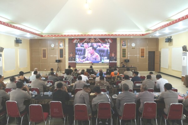 Di Sultra, Wakapolda Sultra Brigjen Pol. Drs. Waris Agono, M.Si bersama Forkompimda Prov. Sultra serta PJU Polda Sultra dan tamu undangan, mendengarkan paparan yang disampaikan oleh Kapolri secara virtual melalui sambungan video conference (vicon) di Aula Dachara Polda Sultra.