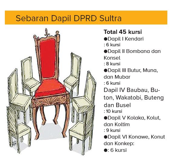 KENDARINEWS.COM – Jumlah kursi DPRD Sultra di pemilu 2024 tak mengalami perubahan. Alasannya jumlah penduduk Bumi Anoa masih di bawah 3 juta jiwa. Setidaknya, 45 kursi legislator diperebutkan di enam daerah pemilihan (lihat grafis).