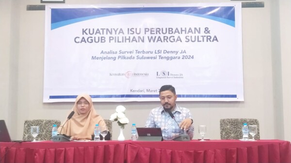 KENDARINEWS.COM–Lembaga Survei Indonseia (LSI) Denny JA merilis hasil survei tentang kuatnya isu perubahan dan Calon Gubernur pilihan Warga Sultra, Rabu (22/3). Digelar Maret 2023, sistem survei menggunakan 800 responden di seluruh Kabupaten dan Kota di Sultra dengan metode wawancara langsung. Tingkat margin of error survei kurang lebih 3,5 persen.
