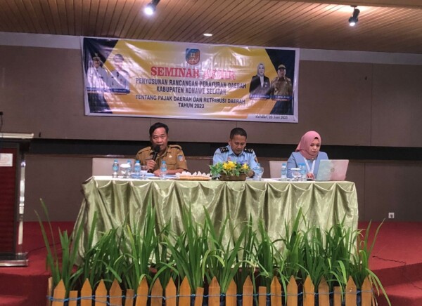 Ia menjelaskan, percepatan penyusunan Raperda menjadi Perda dilakukan sebab akan menjadi acuan dalam penyusunan APBD tahun 2024. Termasuk sebagai pedoman dalam melakukan pemungutan pajak dan retribusi pada tahun mendatang. “Sebelumnya kita telah lakukan seminar awal, dan kini (kemarin) seminar akhir. Tuntas tahapan ini, akan dilanjutkan dengan melahirkan naskah akademik, kemudian melakukan harmonisasi lalu lahirkan Raperda yang selanjutnya disampaikan ke DPRD Konsel untuk dilakukan pembahasan bersama. Sebelum itu kita konsultasikan ke Pemerintah Pusat dan Provinsi untuk ditetapkan jadi Perda,” jelasnya.
