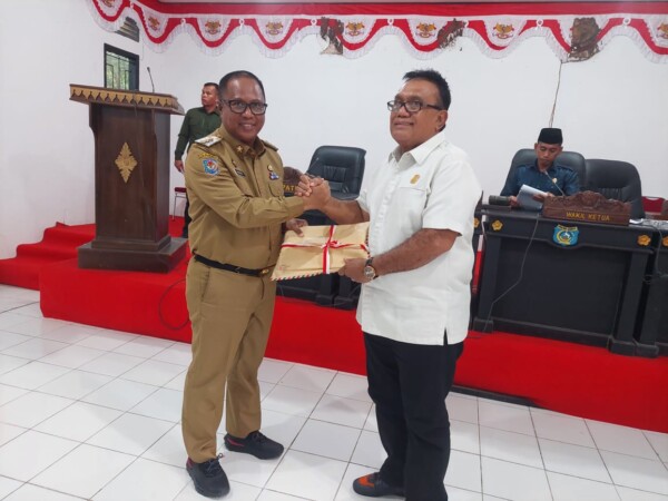 Dokumen Raperda itu diserahkan Pj Bupati Mubar Bahri kepada Wakil Ketua DPRD Mubar Uking Djasa.