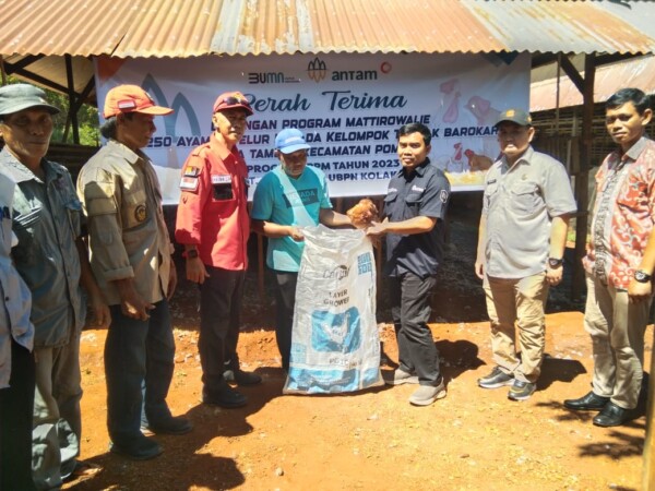 KENDARINEWS.COM— PT Antam Tbk Unit Bisnis Pertambangan Nikel (UBPN) Kolaka menyerahkan 1.250 ekor ayam petelur dan pakan ternak kepada Kelompok Ternak Barokah di Desa Tambea, Kecamatan Pomalaa, Kabupaten Kolaka, Sulawesi Tenggara.