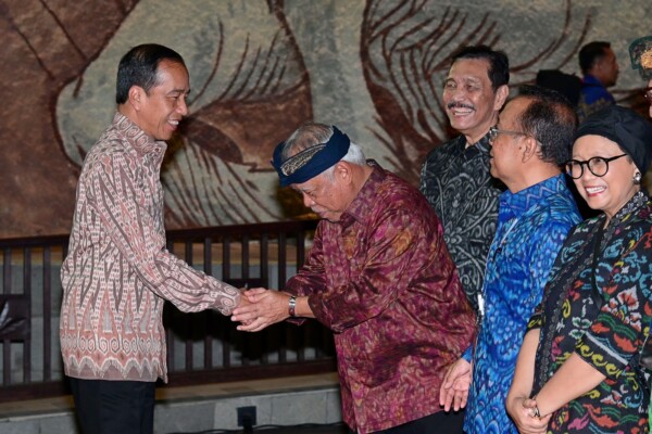 Presiden Jokowi yang mengenakan kemeja kain tenun sintang tiba di GWK, sekitar pukul 18.50 WITA. Presiden Jokowi kemudian menyambut kedatangan para tamu seraya berfoto bersama sebelum memasuki area jamuan.