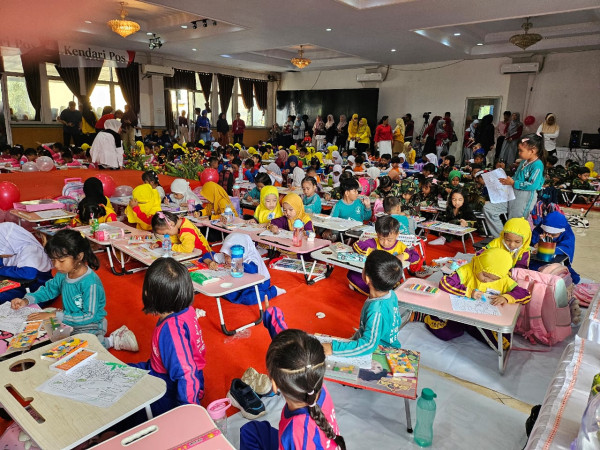 KENDARINEWS.COM— Ratusan anak usia Taman Kanak kanak ikut meramamaikan lomba mewarnai yang digelar Harian Kendari Pos dalam rangka memeriahkan hari Kemerdekaan negara Republik Indonesia ke-79, di Aula Graha Pena Kendari, Jumat (23/8)