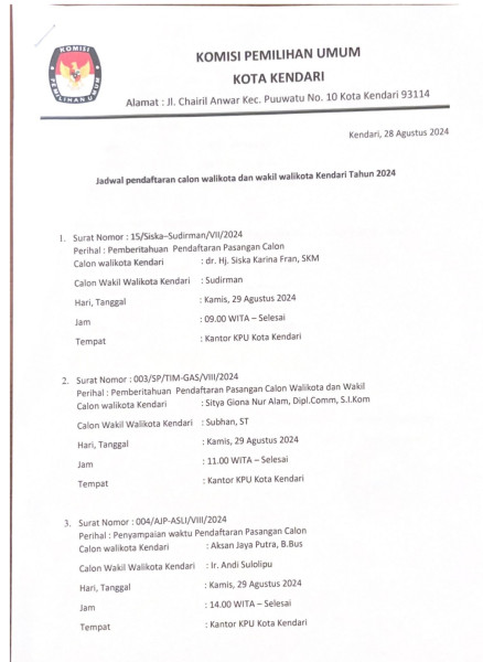 Untuk calon wali kota dan wakil wali kota Kendari, Ketua KPU Kota Kendari Jumwal Saleh mengatakan pihaknya sudah menerima konfirmasi terkait jam dan waktu kedatangan calon kepala daerah. Berikut jadwalnya