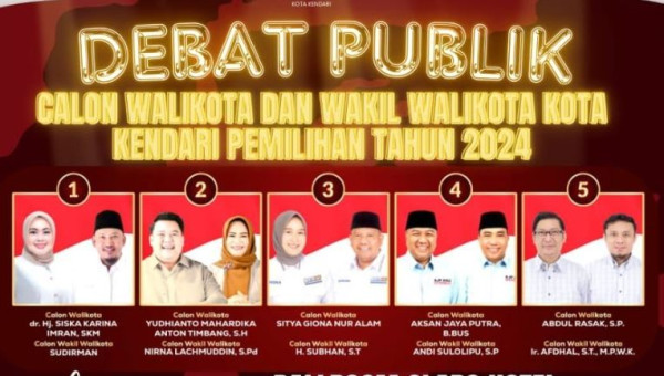 Kendarinews.com — Debat Publik pasangan calon Wali Kota dan Wakil Wali Kota Kendari untuk tahun 2024 akan digelar malam ini, Rabu, 30 Oktober 2024, mulai pukul 19.30 WITA di Ballroom Claro Hotel Kendari. Acara ini akan disiarkan langsung oleh beberapa stasiun televisi lokal, termasuk SultraTV, BatamTV, KawanuaTV, Timor TV, Fajar TV, dan Jawapos TV, serta dapat disaksikan melalui streaming di channel YouTube KPU Kota Kendari. (ryl)