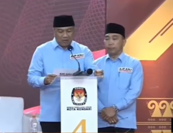 KENDARINEWS.COM–Pasangan calon (Paslon) Wali Kota dan Wakil Wali Kota Kendari, nomor urut 1 Aksan Jaya Putra (AJP)-Andi Sulolipu (ASLI) menyampaikan visi dan misi pada debat publik perdana yang digelar Komisi Pemilihan Umum (KPU) di Claro Kendari, kemarin.