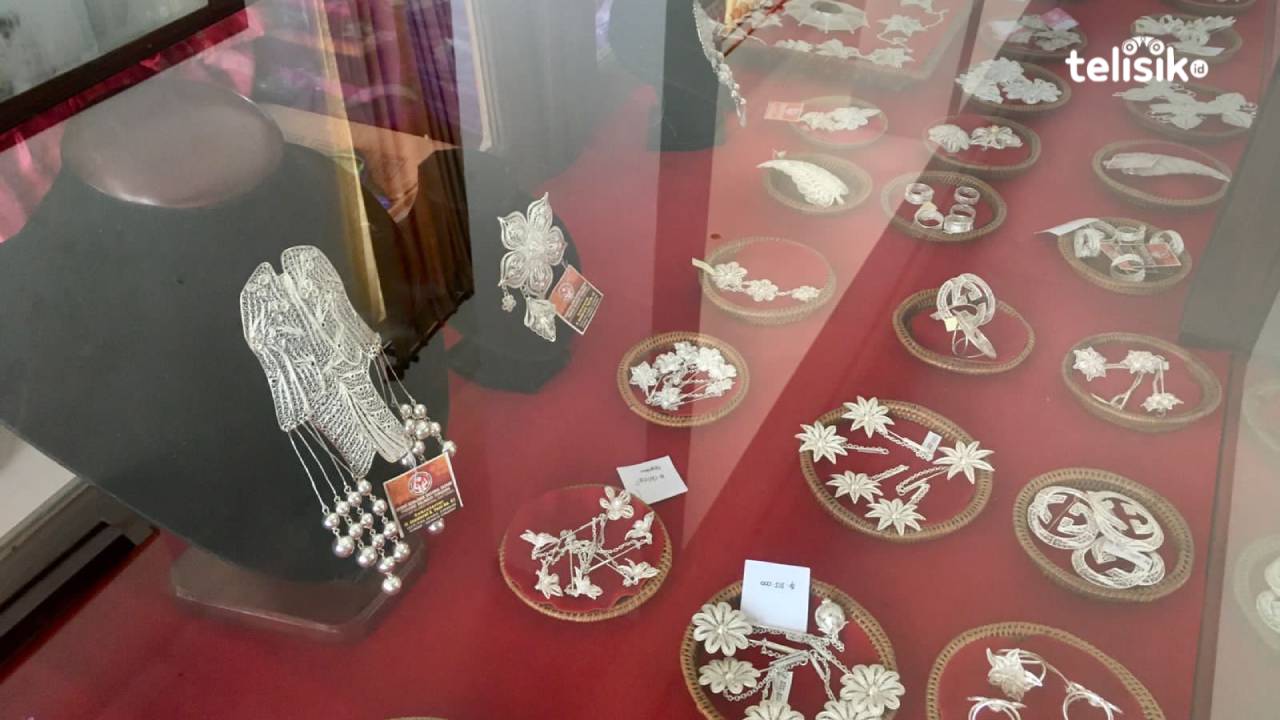 Kerajinan perak Kendari beraneka bentuknya yang indah seperti bros berbentuk bunga, cincin, dan ornamen kalung bertumpuk di dalamnya.