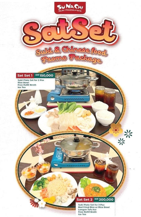Promo ini menawarkan dua pilihan paket spesial. Paket Sat Set 1 seharga Rp150.000 mencakup Suki Plate Set untuk dua orang, Rice Bowl, free refill broth, dan Ice Tea. Sementara itu, Paket Sat Set 2 dibanderol Rp200.000 dan menawarkan tambahan menu pilihan Red Fried Rice atau Rice Bowl, Longan Tofu Ice, free refill broth, dan Ice Tea.