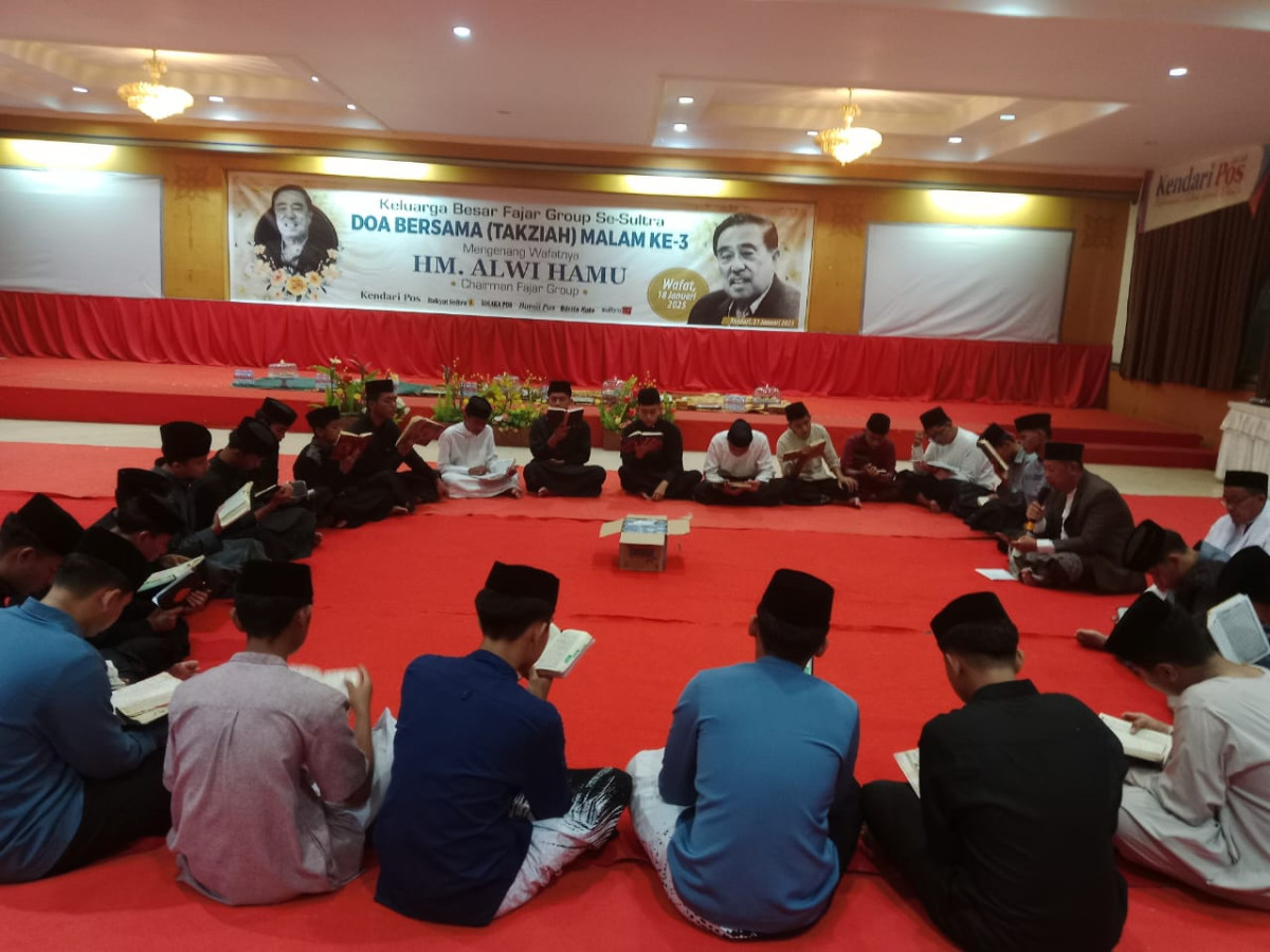 KENDARINEWS.COM— Mengenang berpulangnya tokoh pers nasional yang juga Chairman Fajar Group Alwi Hamu, segenap keluarga besar Fajar Group se Sultra menggelar takziah malam ke tiga, di Aula Graha Pena Kendari Pos, Selasa (21/1)