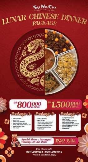 Untuk memberikan pengalaman makan malam yang lebih spesial, Sunachi Suki Restaurant menawarkan tiga variasi paket. Paket A menyajikan menu lengkap yang terdiri dari suki 8 basket, nasi putih, tumis sapi oriental, udang goreng tepung, tumis ayam saus Mongolian, singkong ala Thai, dan kue Imlek. Paket B hadir dengan hidangan istimewa, termasuk suki 8 basket, nasi putih, tumis sapi lada hitam, ayam goreng terasi, udang saus Malaysia, es campur ala Thai, dan kue Imlek. Sementara itu, Paket C menawarkan variasi berbeda dengan sup sapi cincang, nasi putih, ikan goreng tepung saus asam manis, cumi goreng telur asin, buncis bawang putih, buah potong segar, dan kue Imlek.