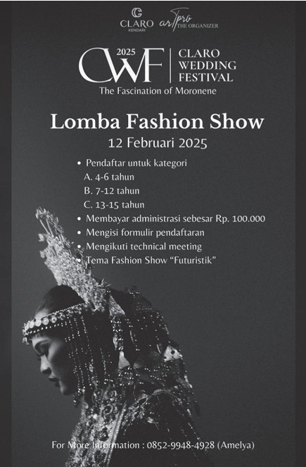Bagi masyarakat yang ingin mendaftarkan anak-anaknya dapat langsung menghubungi panitia di nomor 0852-9948-4928 (Amelya). Pastikan warga metro dan sekitarnya tidak melewatkan kesempatan ini dan jadilah bagian dari kemeriahan Claro Wedding Festival 2025. Dengan konsep yang segar dan unik, Claro Kendari terus berinovasi untuk menghadirkan event event terbaik bagi masyarakat Kota Kendari.