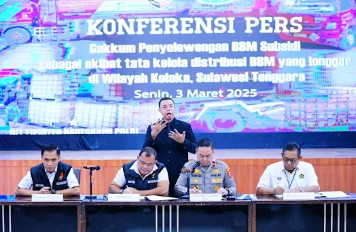 KENDARINEWS.COM—Dittipidter Bareskrim Polri menggelar konferensi pers terkait pengungkapan penyelewengan Bahan Bakar Minyak (BBM) subsidi yang terjadi di wilayah Kolaka, Sulawesi Tenggara.