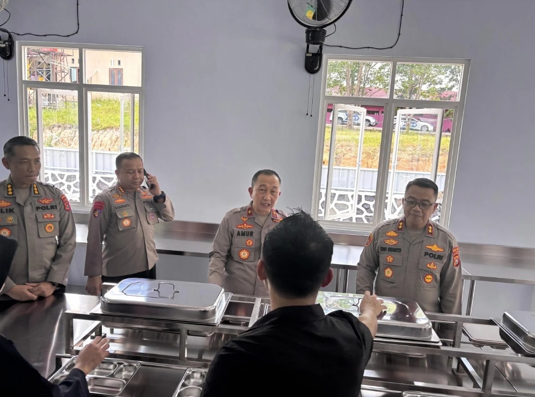 KENDARINEWS.COM—Kepala Kepolisian Daerah (Kapolda) Sulawesi Tenggara (Sultra), Irjen Pol Dwi Irianto, S.IK., M.Si., bersama Wakil Kepala Kepolisian Daerah (Wakapolda) Sultra, Brigjen Pol Amur Chandra Juli Buana, S.H., M.H., dan Pejabat Utama (PJU) Polda Sultra melakukan pengujian langsung terhadap peralatan dapur milik Satuan Pelayanan Pemenuhan Gizi (SPPG) di Mako Brimob Sultra, Kamis (1/5).