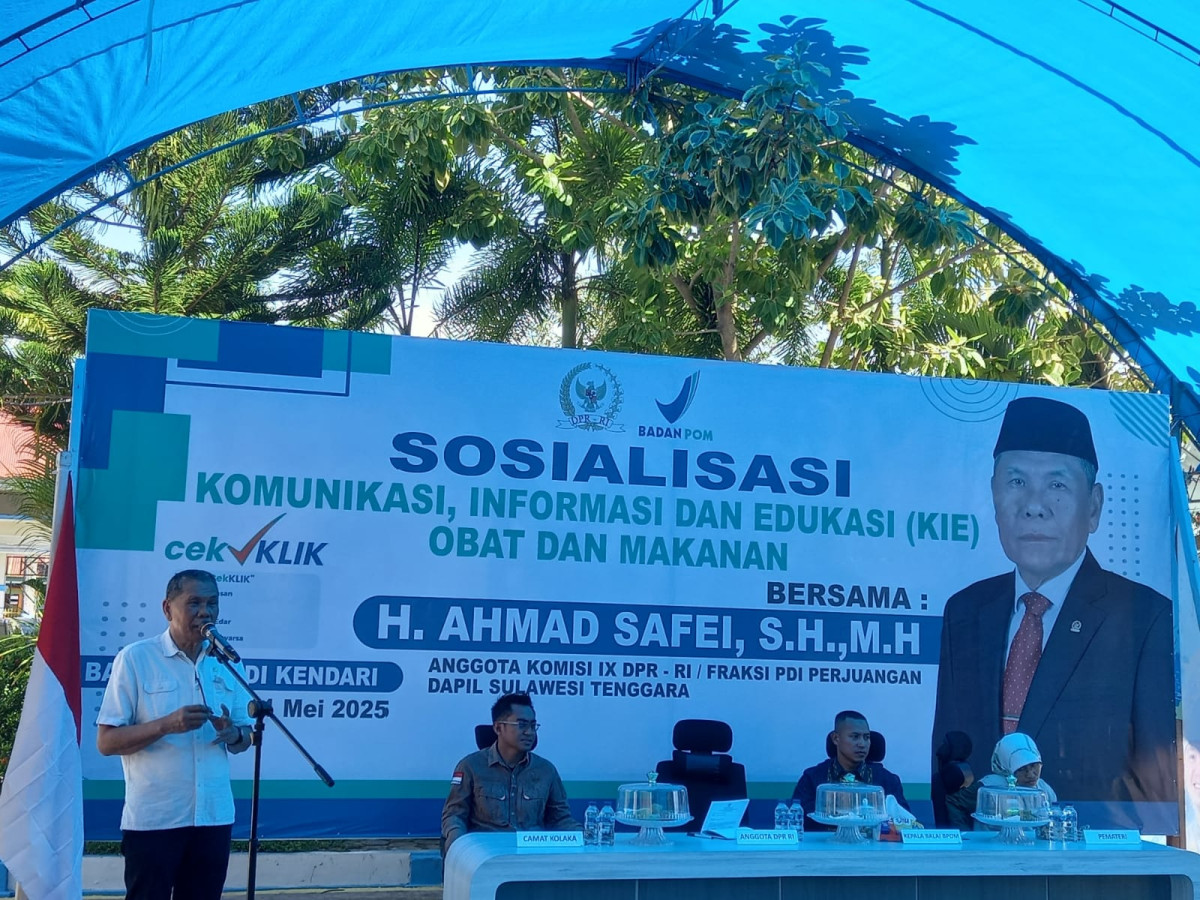 KENDARINEWS.COM—- Banyaknya produk makanan dan obat-obatan yang beredar di masyarakat dikhawatirkan memberikan dampak negatif bagi kesehatan konsumen. Olehnya itu, untuk mengantisipasi kejadian tersebut terjadi di Sulawesi Tenggara (Sultra), maka Anggota Komisi IX DPR RI menggandeng Badan Pengawas Obat dan Makanan (BPOM) untuk menggelar sosialisasi, komunikasi, informasi dan edukasi obat dan makanan di Kabupaten Kolaka, Minggu (11/5). Sosialisasi yang digelar di halaman Kantor Camat Kolaka itu dihadiri oleh pemerintah kecamatan dan kelurahan yang ada di Kecamatan Kolaka dan Latambaga.