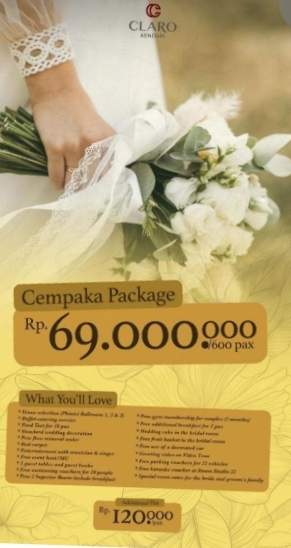 Paket ini meliputi pilihan venue megah di Phinisi Ballroom 1, 2, dan 3, lengkap dengan dekorasi standar pernikahan, layanan katering prasmanan untuk 600 orang, serta hiburan musik dan MC profesional. Tidak hanya itu, Claro juga menyediakan red carpet, entertainment lengkap dengan penyanyi, serta buku tamu dan meja penerima tamu.