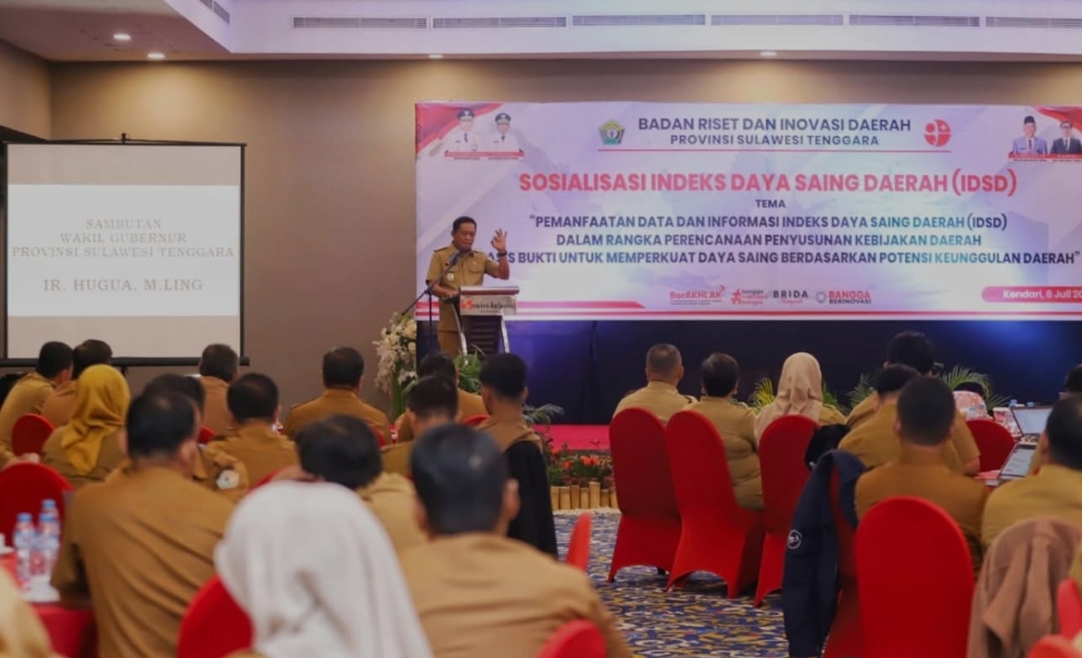 KENDARINEWS.COM–– Wakil Gubernur Sulawesi Tenggara (Sultra), Ir. Hugua, M.Ling., menekankan pentingnya Indeks Daya Saing Daerah (IDSD) dalam memperkuat daya saing daerah, saat membuka Sosialisasi IDSD yang diselenggarakan Badan Riset dan Inovasi Daerah (BRIDA) Sultra di Swiss-Belhotel Kendari, Selasa (8/7).