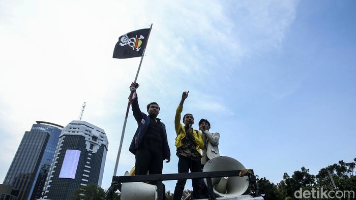 Pantauan di lapangan, massa aksi yang berasal dari berbagai kampus di Surabaya datang dengan membawa sejumlah spanduk tuntutan. Seorang orator bahkan mengibarkan bendera One Piece di atas mobil komando, yang kemudian diikuti oleh peserta aksi lainnya.