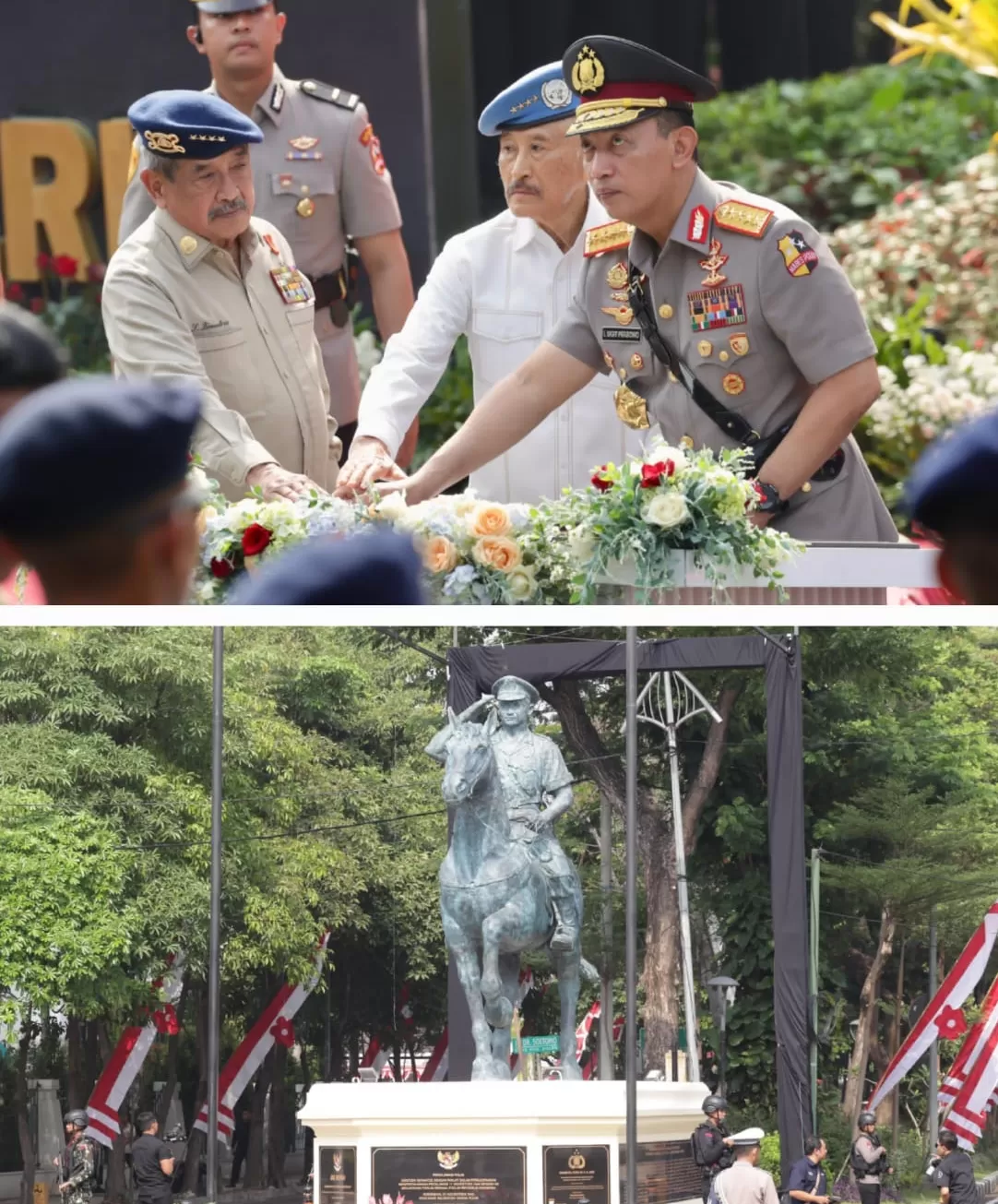 KENDARINEWS.COM –Patung pahlawan nasional Polri, Komisaris Jenderal Polisi (Purn) Moehammad Jasin, diresmikan dalam rangkaian upacara Hari Juang Polri 2025 di Jalan Dr. Soetomo, Surabaya, Kamis (21/8). Patung berwarna biru itu menggambarkan sosok Jasin menunggangi kuda sambil memberi hormat.