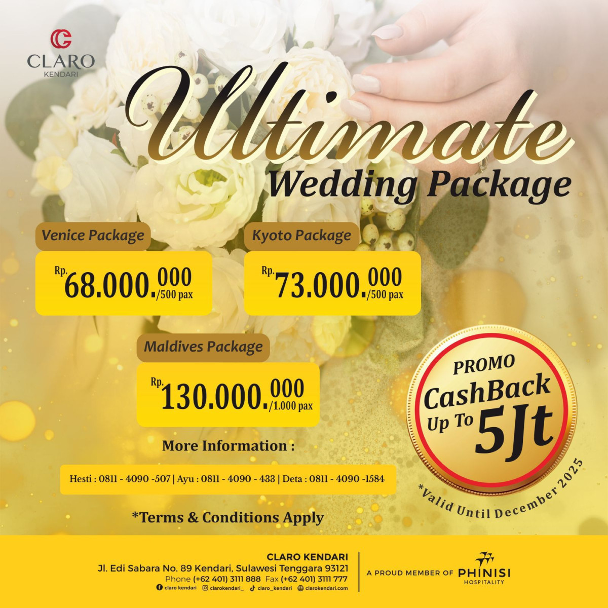 “Untuk informasi lebih lanjut, calon pengantin dapat menghubungi tim wedding Claro Kendari di nomor 0811 4090 507 (Hesti) dan 0811 4090 1584 (Deta). Jangan melewatkan kesempatan ini,” pungkasnya.