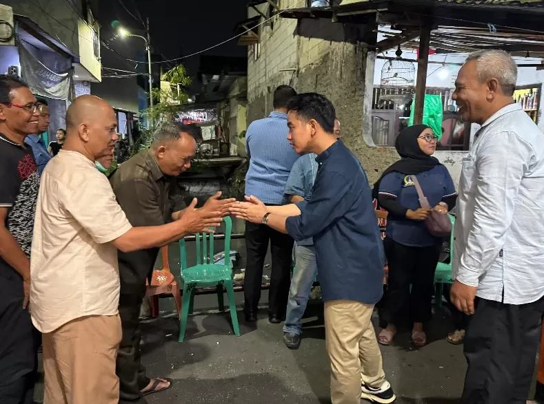 Usai meninjau pos siskamling, Gibran menyempatkan diri mengunjungi Sentra Kue Subuh Pasar Senen Jaya 1 & 2, Kwitang, Jakarta Pusat. Suasana pasar malam itu ramai oleh pedagang kue tradisional dan modern yang berjualan.