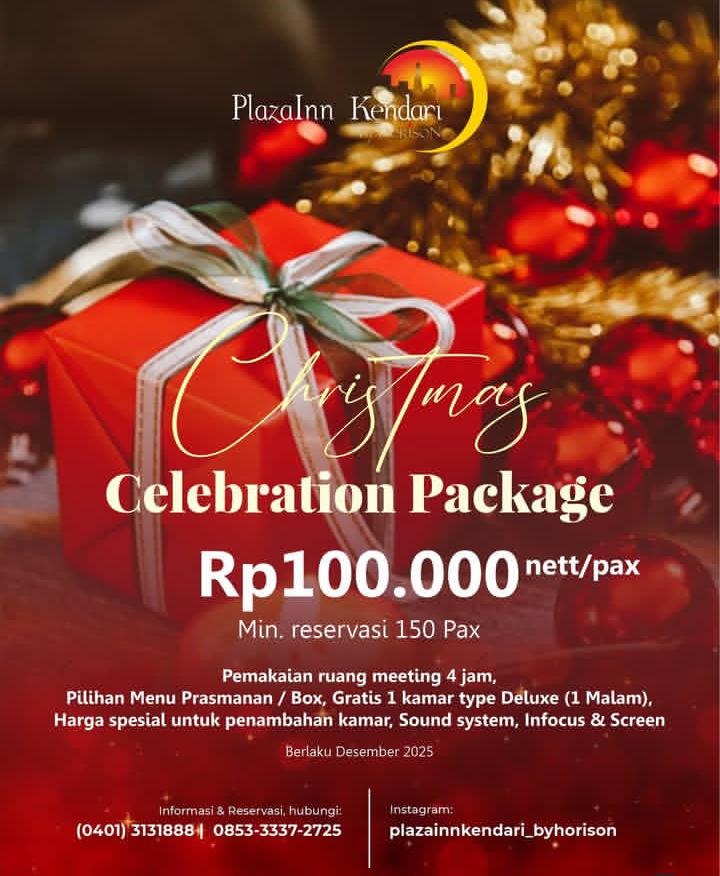 Hajrah menambahkan, promo “Christmas Celebration Package” ini berlaku sepanjang bulan Desember 2025, memberikan fleksibilitas bagi masyarakat untuk memilih tanggal perayaan yang paling sesuai. “Setiap tahun, kami ingin menjadi bagian dari kebahagiaan tamu dalam merayakan Natal. Dengan harga yang terjangkau dan fasilitas lengkap, kami berharap PlazaInn Kendari bisa menjadi pilihan utama untuk berbagai acara perayaan,” jelasnya.