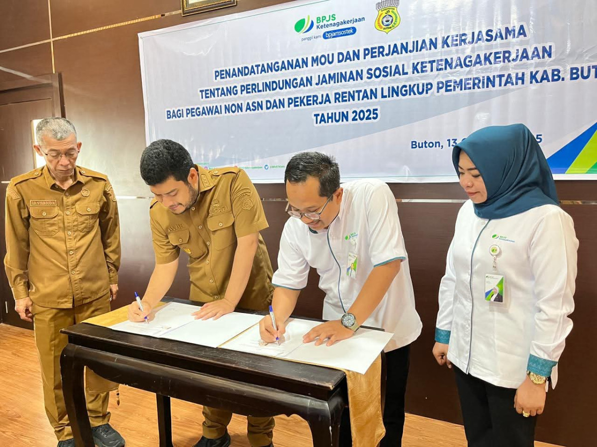 Momentum penting ini ditandai dengan penandatanganan Memorandum of Understanding (MoU) dan Perjanjian Kerja Sama tentang perlindungan jaminan sosial ketenagakerjaan bagi pegawai non-ASN dan pekerja rentan di lingkungan Pemkab Buton. Acara berlangsung di Aula Kantor Bupati Buton, Pasarwajo, pada Senin (13/10).