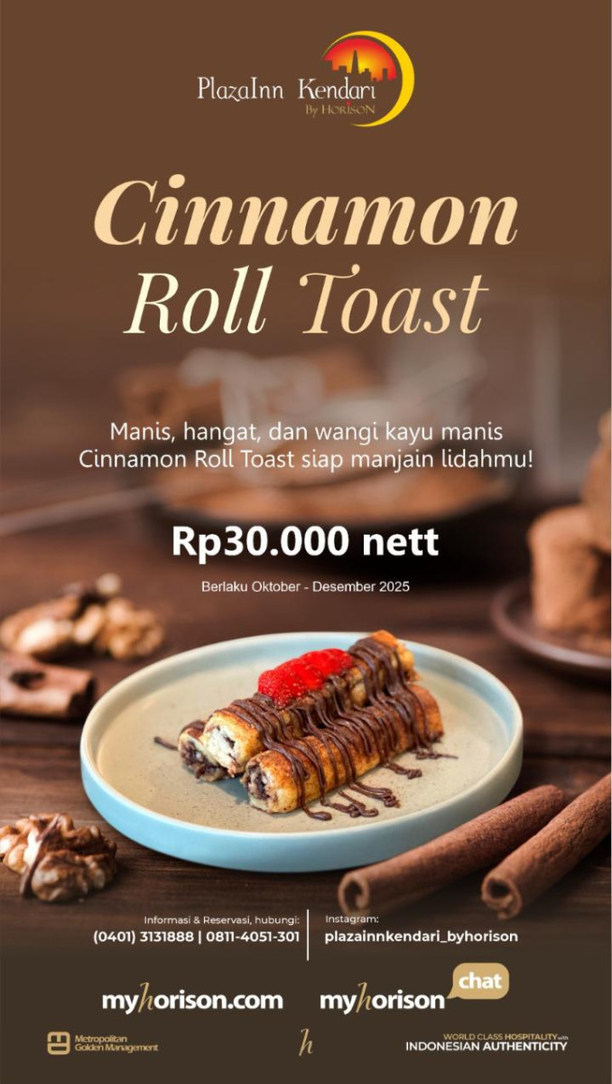 Hajrah, Marketing Communication PlazaInn Kendari, mengungkapkan bahwa menu spesial ini ditawarkan dengan harga yang sangat terjangkau, hanya Rp30.000 nett! Kamu bisa menikmati kelezatan Cinnamon Roll Toast ini mulai Oktober hingga Desember 2025.