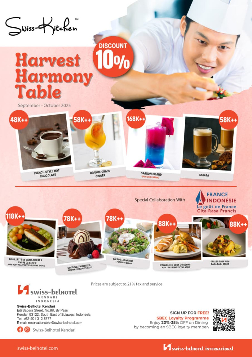 KENDARINEWS.COM — Menyambut akhir tahun 2025, Swiss-Belhotel Kendari kembali menghadirkan inovasi kuliner bertajuk “Harvest Harmony Table”, sebuah promo istimewa yang berlangsung sepanjang September hingga Oktober 2025. Program ini menawarkan pengalaman bersantap berkelas internasional dengan diskon 10 persen untuk berbagai hidangan dan minuman spesial yang memadukan kuliner Indonesia dan Prancis.