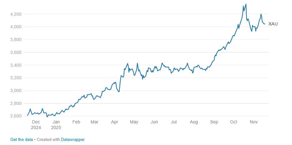 Pada perdagangan Senin (17/11/2025), harga emas dunia turun 0,86% ke level US$4.044,25 per troy ons, sementara pada intraday sempat menyentuh US$4.006,30 per troy ons atau turun sekitar 1%. Pelemahan ini membuat harga emas anjlok hingga 3,7% selama tiga hari berturut-turut.