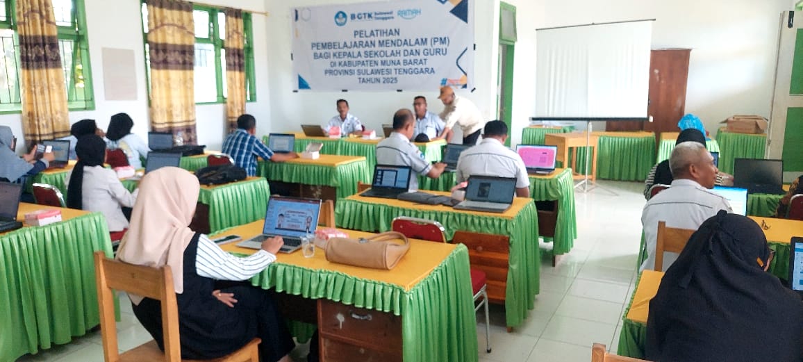 Fasilitator dari Balai Guru dan Tenaga Kependidikan (BGTK) Mubar, La Ente, M.Pd., menjelaskan bahwa pelatihan diselenggarakan oleh BGTK Provinsi Sulawesi Tenggara. Materi yang diberikan meliputi konsep PM, strategi penerapan pembelajaran mendalam, pemanfaatan teknologi digital, serta penyusunan penilaian yang lebih komprehensif. Semua itu diarahkan untuk mengembangkan kemampuan berpikir kritis, karakter, dan kreativitas siswa.