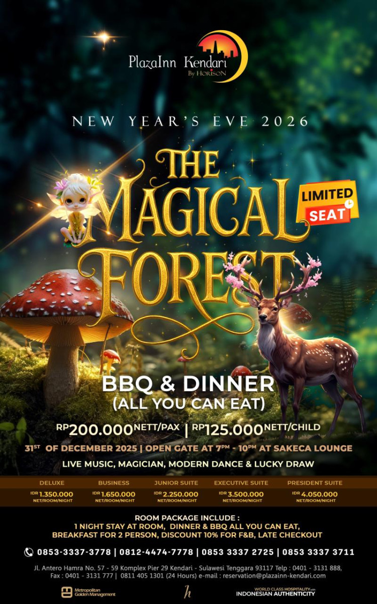 Konsep The Magical Forest sendiri dipilih untuk menghadirkan suasana penuh kehangatan dan keajaiban. Reservasi dapat dilakukan melalui kontak resmi PlazaInn Kendari di 0853-3337-3778, 0812-4474-7778, 0853-3337-2725, 0853-3337-3711, atau melalui email reservation@plazainn-kendari.com.