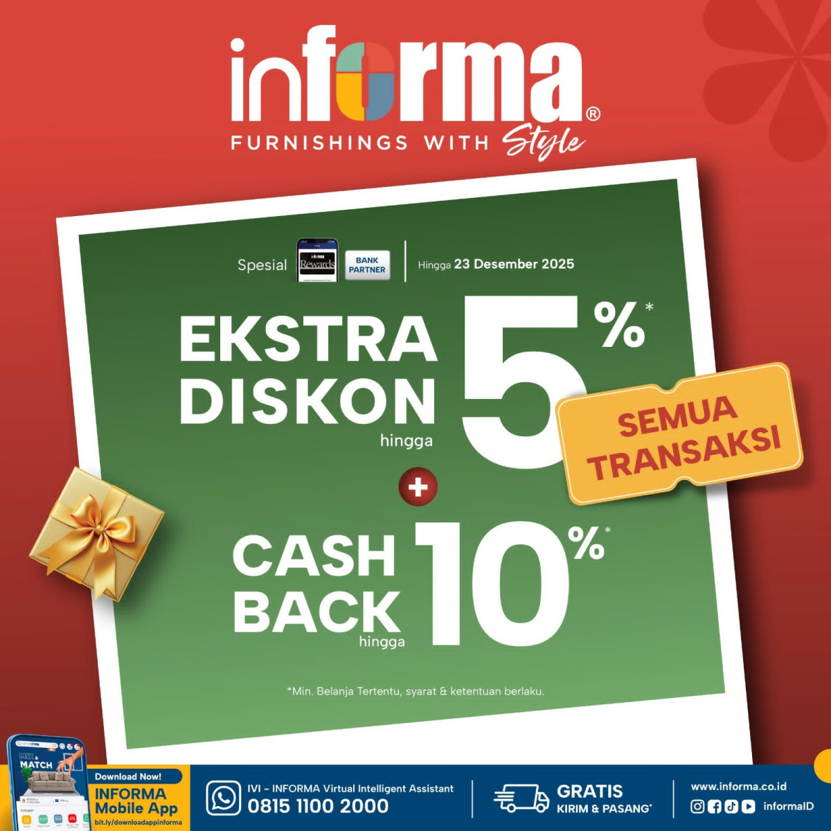 KENDARINEWS.COM — Informa, pusat furnitur dan gaya hidup terlengkap di Indonesia, kembali menghadirkan promo menarik bagi masyarakat Kendari. Melalui program penawaran akhir tahun, Informa Kendari memberikan ekstra diskon hingga 5 persen serta cashback hingga 10 persen untuk seluruh transaksi, yang berlaku sampai 23 Desember 2025.