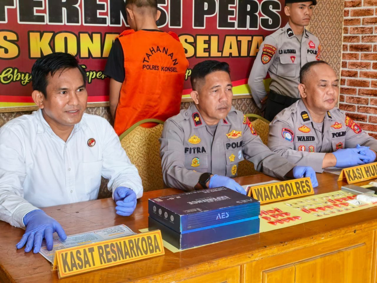 Pelaku dijerat Pasal 114 ayat (2) Undang-Undang RI Nomor 35 Tahun 2009 tentang Narkotika dan/atau Pasal 609 ayat (2) huruf a Undang-Undang RI Nomor 1 Tahun 2023 tentang KUHP sebagaimana telah disesuaikan dalam Undang-Undang RI Nomor 1 Tahun 2026. Polres Konsel menegaskan akan terus mengembangkan kasus untuk mengungkap jaringan peredaran yang lebih luas dan menindak tegas pelaku sesuai hukum.