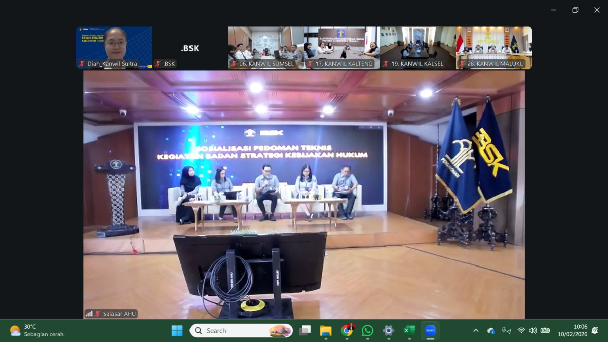 KAENDARINEWS.COM- – Kantor Wilayah Kementerian Hukum Sulawesi Tenggara (Kanwil Kemenkum Sultra) mengikuti secara daring kegiatan Sosialisasi Pedoman Teknis Kegiatan Badan Strategi Kebijakan (BSK) Hukum di Wilayah, Selasa (10/2/2026).