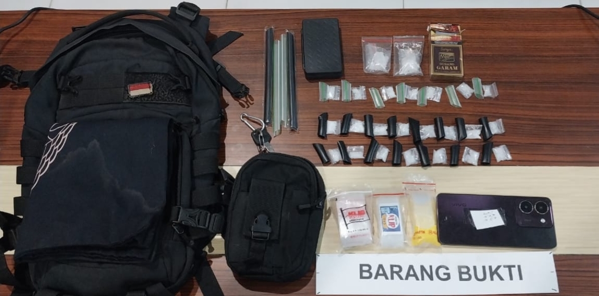 Dari hasil penggeledahan tas ransel hitam milik pelaku, polisi menemukan sejumlah barang bukti diantaranya 24 sachet plastik klip bening berisi kristal bening diduga sabu dengan berat bruto 27,59 gram, 1 buah timbangan digital, 3 ball plastik klip kosong, dan 1 bungkus rokok Surya berisi 2 sachet sabu.